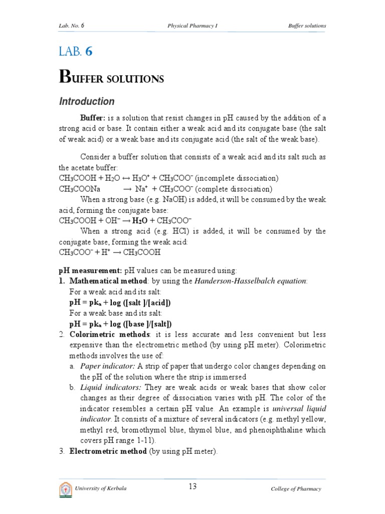 Lab. 6 Buffer Solutions Buffer Solution Ph Lab Report Buffer Solution a buffer is a solution that resists changes to ph when a strong acid or base is added to the solution. these solutions are known as buffer systems. buffer solutions are chemical solutions that resist changes in ph when added with an acid or a base. biochemical experiments routinely require a buffer. It is a mixture. Lab Report Buffer Solution.