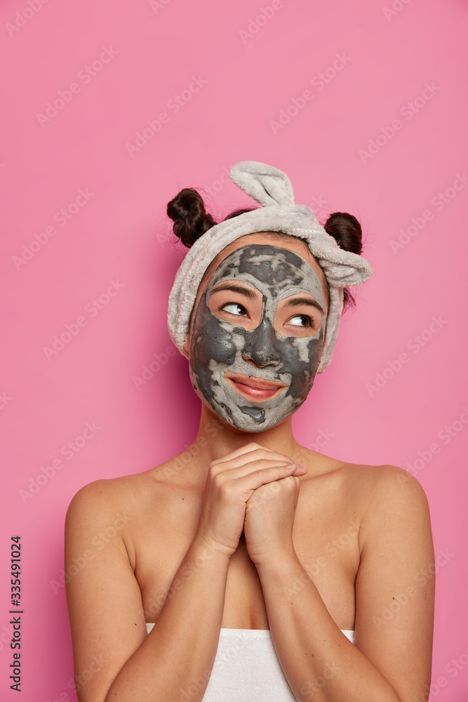 Natural beauty, skin care concept. Dreamy pleased Asian woman applies clay mask on face, keeps