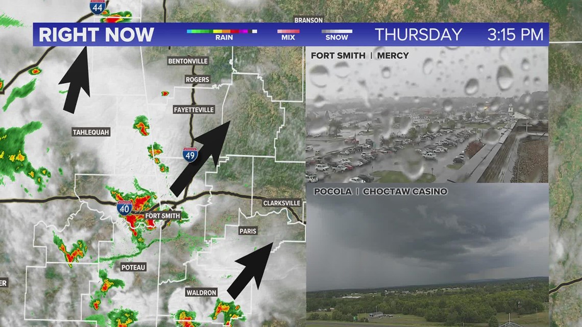 Scattered storms moving from Oklahoma into Arkansas RADAR
