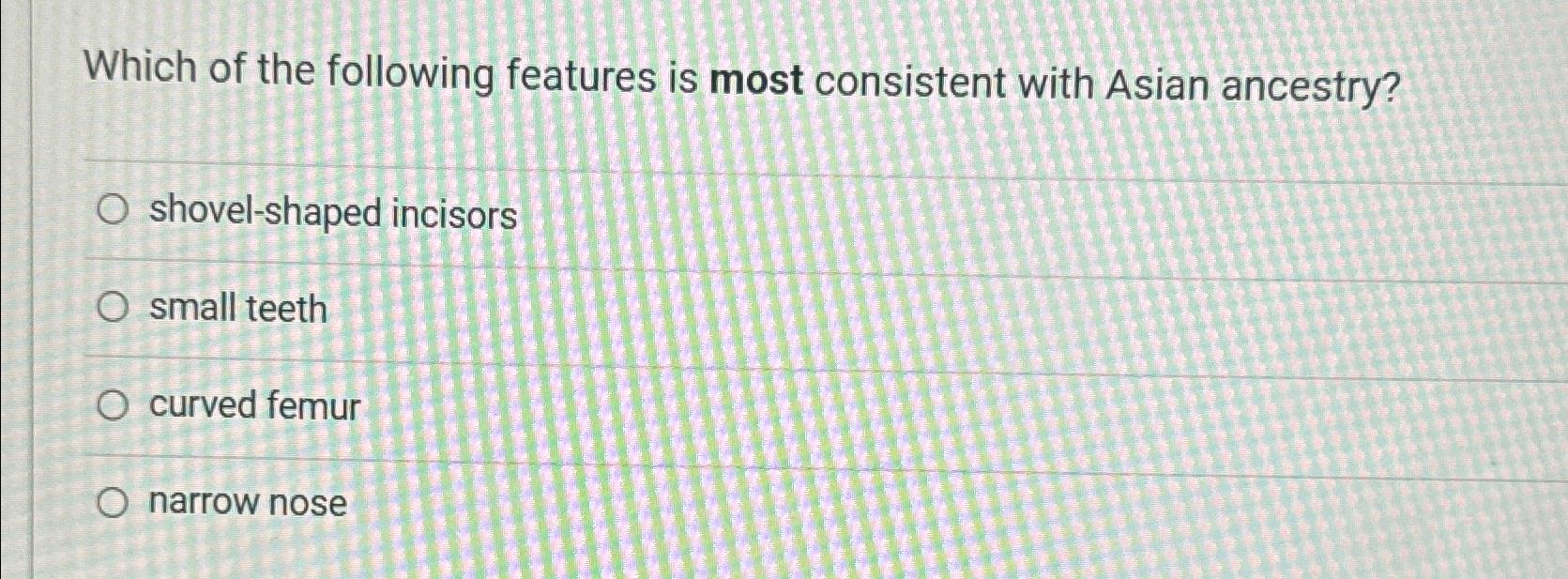 Solved Which of the following features is most consistent Shovel-Shaped Incisors Asian shovel shape of upper incisors is a common characteristic in asian and native american populations but is rare or absent in african. sinodonty, common among east asian and native american populations, is a combination of dental characteristics that. sinodonty, common among east asian and native american populations, is a combination of dental characteristics that. Shovel-Shaped Incisors Asian.