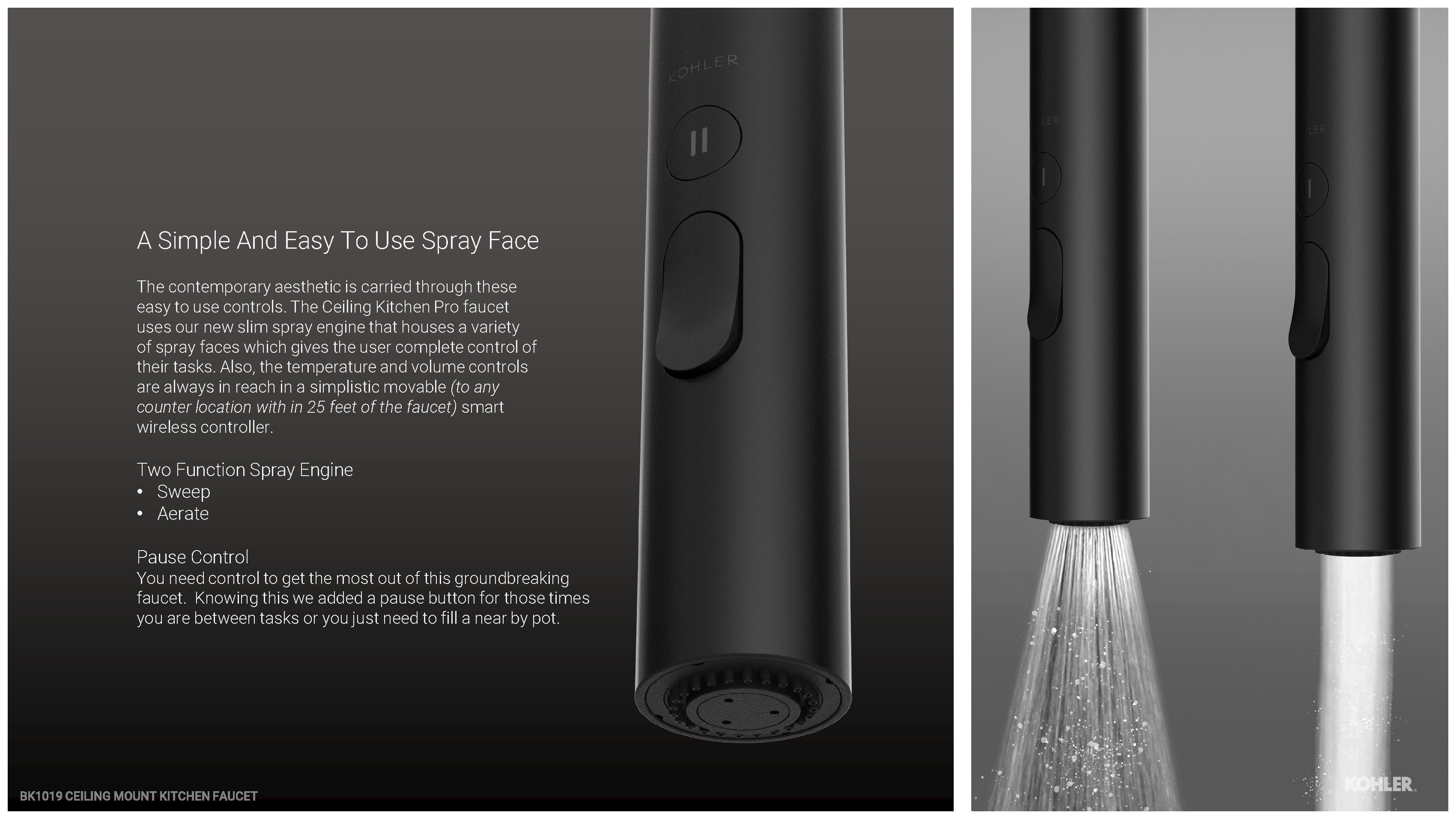 Purist Suspend CeilingMount Kitchen Faucet K29179 KOHLER KOHLER Ceiling Mount Kitchen Faucet the purist suspend kitchen faucet mounts from your ceiling and is out of your way until you want to use it. The faucet's hose is mounted on the ceiling with a precise pivoting arm. Swiveling 7' (2.14 m) braided hose. brett wagner with kohler, shares the purist suspend faucet. Swing arm rotates 180° for full sink coverage. . Ceiling Mount Kitchen Faucet.