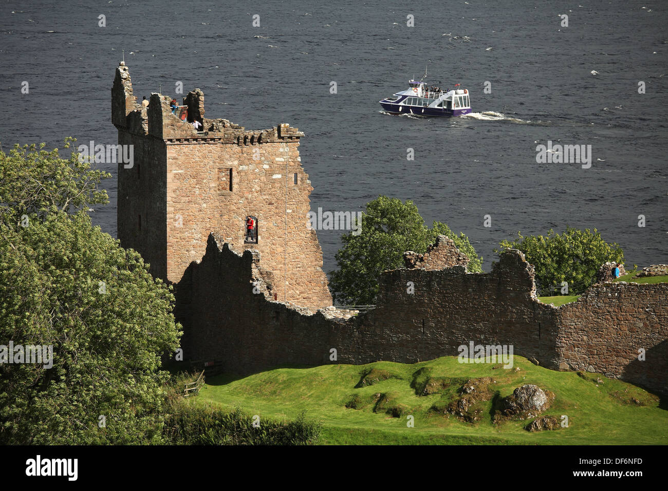 Tourist boat and Urquhart Castle. Loch Ness. Inverness. Scotland Stock