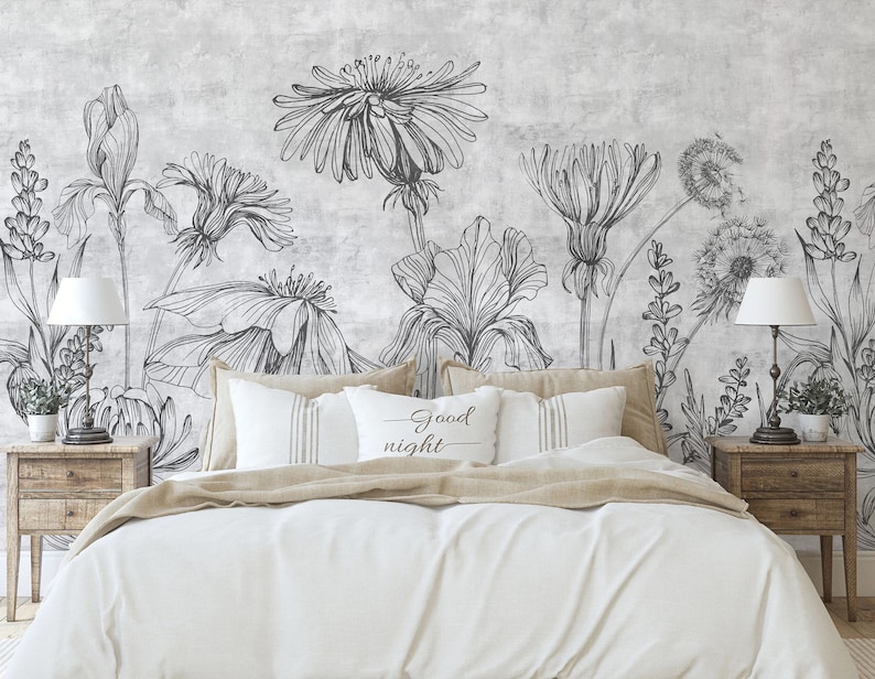 Large Floral Wallpaper Peel and Stick Grunge Floral Drawing Etsy