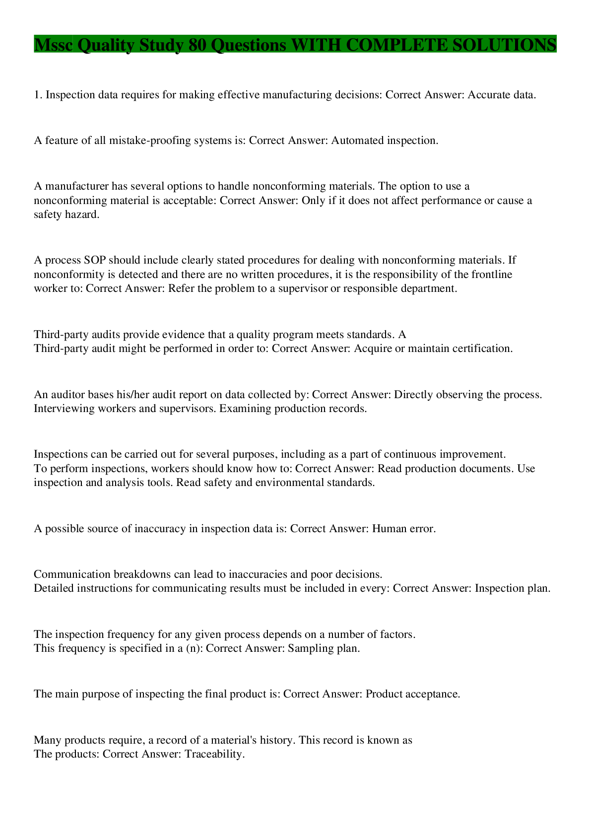 Mssc Quality Study 80 Questions WITH COMPLETE SOLUTIONS Browsegrades