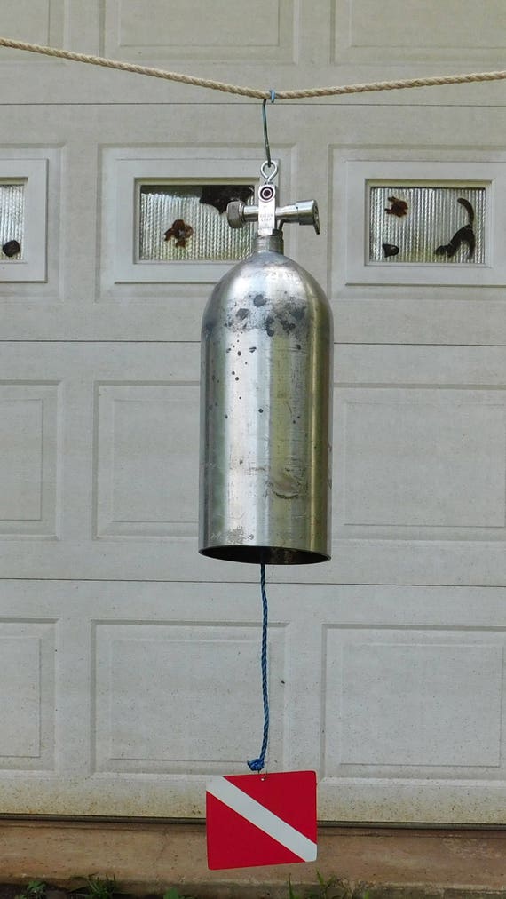 Scuba diver diving tank bell wind chime gong by PSACustomCreations Scuba Tank Bell I was at an event recently where someone had the most amazing array of instruments made from recycled stuff. This tank was made back in 1972 and has the original valve on it. As you can see, this is a bell made from a scrap. Aluminum scuba tank bell windchime, swirl finish with star, garden, deck or patio accent, ocean. Scuba Tank Bell.