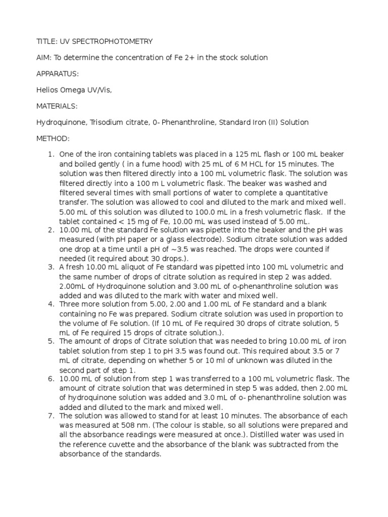 Spectrophotometric Determination of Iron Lab Spectrophotometric Spectrophotometry Lab Report Discussion an introduction to the spectrophotometer for biology students: download spectrophotometry sample lab report and more study guides, projects, research chemistry in pdf only. Obtain an absorbance spectrum for a molecule. As indicated by equation 7.3, a plot of the absorbance at a given wavelength for a particular species versus the concentration of the species yields a straight line. Spectrophotometry Lab Report Discussion.