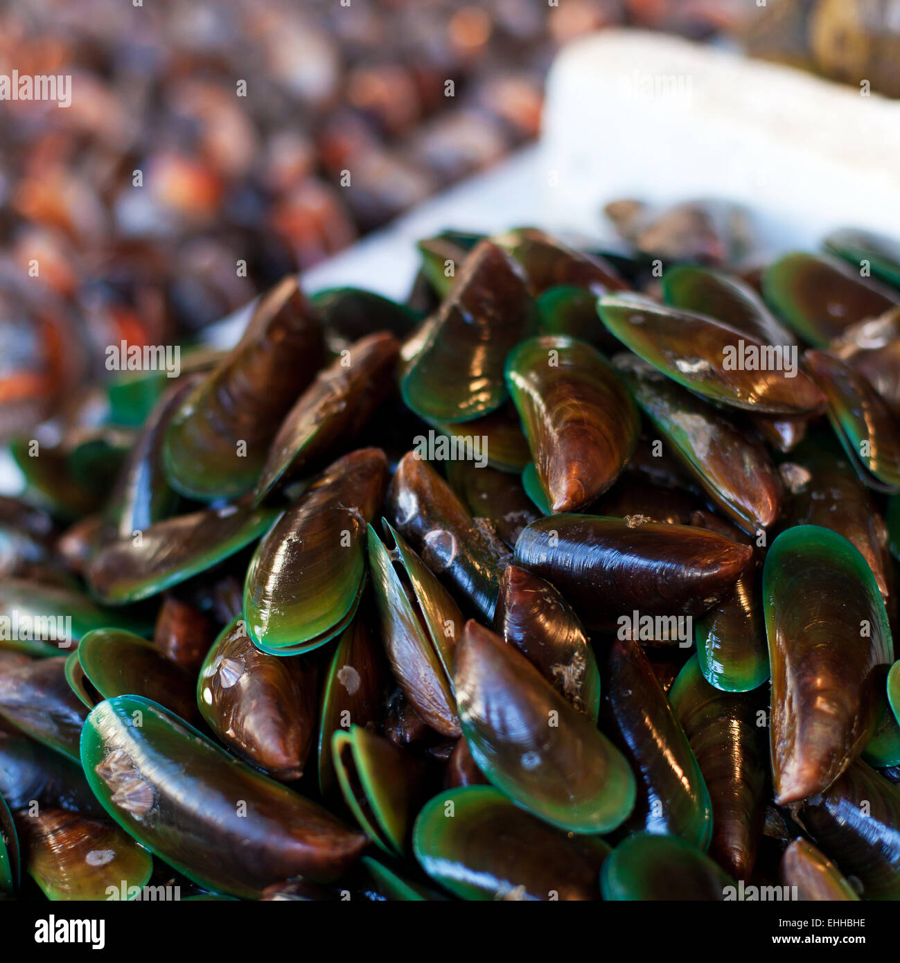 Oysters, mussels and scallops on asian market Stock Photo Alamy