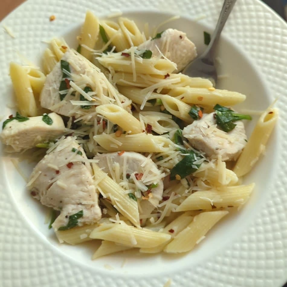 Cook pasta, chicken and garlic in one skillet and top with parmesan cheese. This easy recipe is perfect for a quick and satisfying meal. A healthy and easy weeknight dinner for two with lean chicken, sautéed spinach and lemon zest. Makes approximately 4 servings ⋅ adapted from eating well.