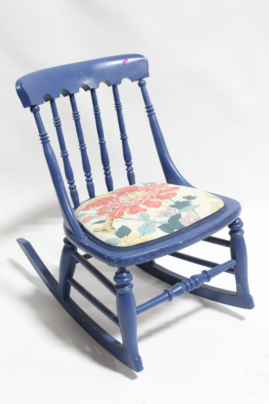 chair child s small rocker kid size no arms turned spindles floral upholstered seat wood blue