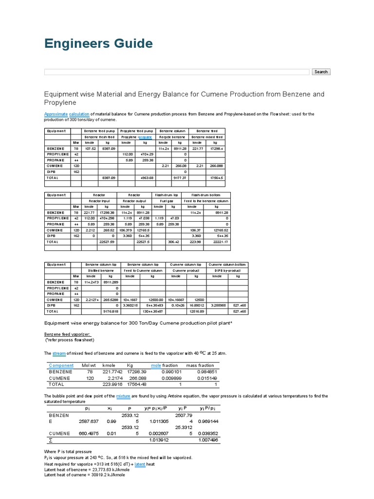 Engineers Guide Equipment Wise Material and Energy Balance For Cumene