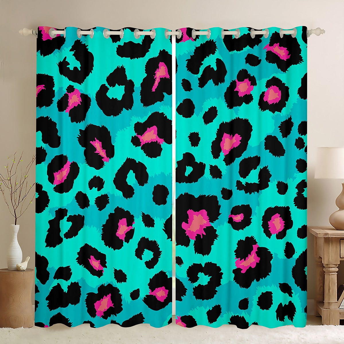 YST Kids Turqoise Cheetah Print Curtains Black Pink Leopard Print