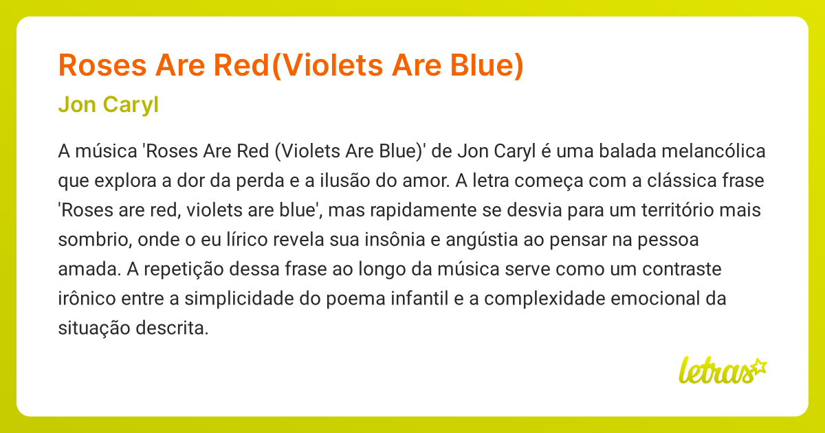 Significado da música Roses Are Red(Violets Are Blue) (Jon Caryl Roses Are Red Violets Are Blue Jon Caryl See lyrics and music videos, find jon caryl tour dates, buy concert tickets, and more! Make the most of your lyrics with musixmatch pro! Jon caryl · song · 2020. Listen to roses are red (violets are blue) by jon caryl. Lyrics for roses are red (violets are blue) by jon caryl. Listen to roses are red (violets are blue). Roses Are Red Violets Are Blue Jon Caryl.