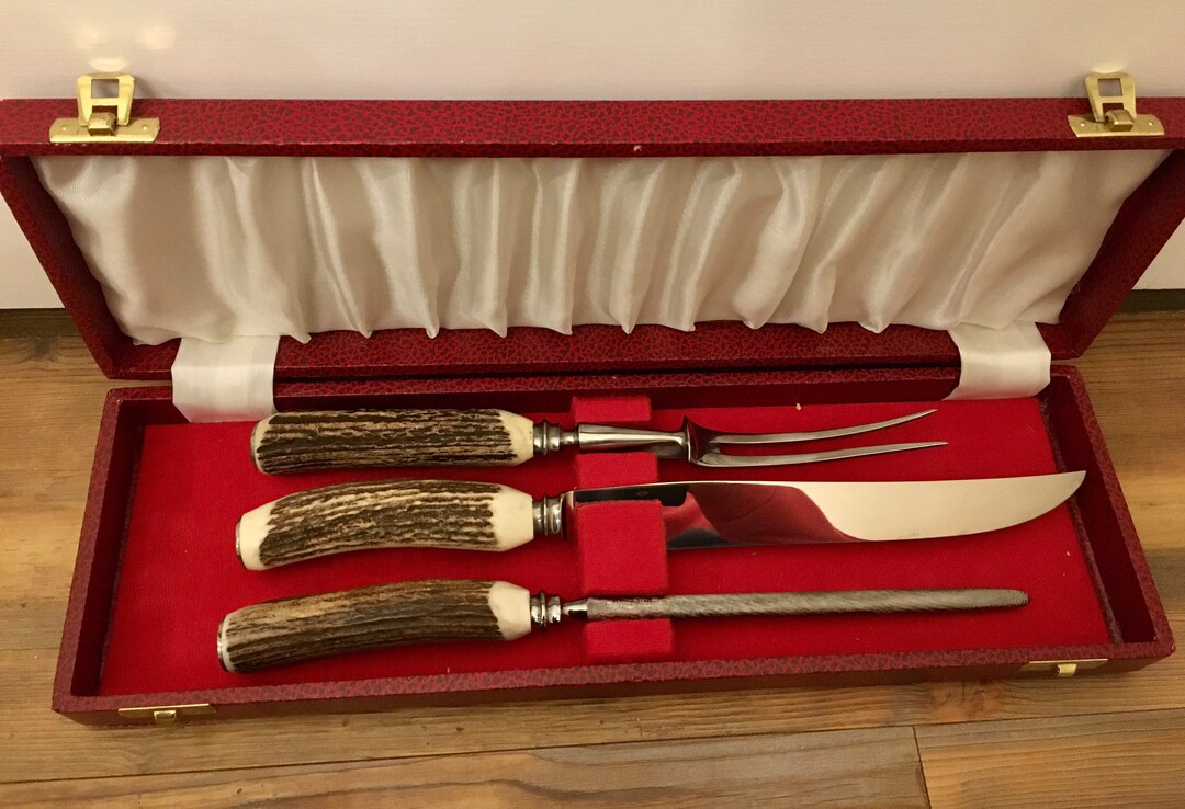 Vintage 1950's Lifetime Sheffield Carving Set 3piece Etsy Sheffield Carving Set 3-Piece Bone Antler Stag, antler, horn, stainless steel, steel. The intricate sheffield england design is. A sharpening steel measuring approximately. Stag antler handles with stainless steel. A lovely vintage sheffield carving set with genuine antler handles, the set includes a carving knife, fork and sharpener. 3 piece vintage carving set. Sheffield Carving Set 3-Piece Bone Antler.
