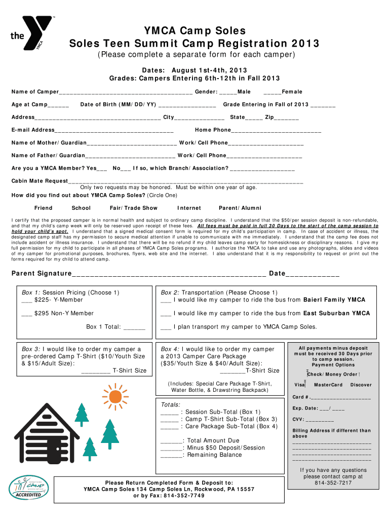 Fillable Online campsoles YMCA Camp Soles Soles Teen Summit Camp Registration 2013 campsoles