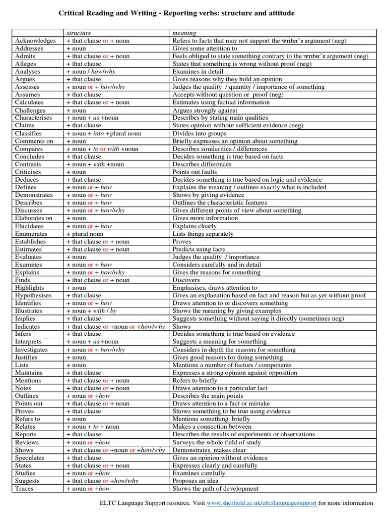 ELT Concourse reporting verbs in EAP Reporting Verbs Table Pdf the following table from the study & learning centre, rmit (2005) clarifies how to use reporting verbs effectively in. In academic writing, it is necessary to refer to the research of others using. in the table below, the main reporting verbs in english are classified in terms of their function, and their strength. use reporting verbs to. Reporting Verbs Table Pdf.