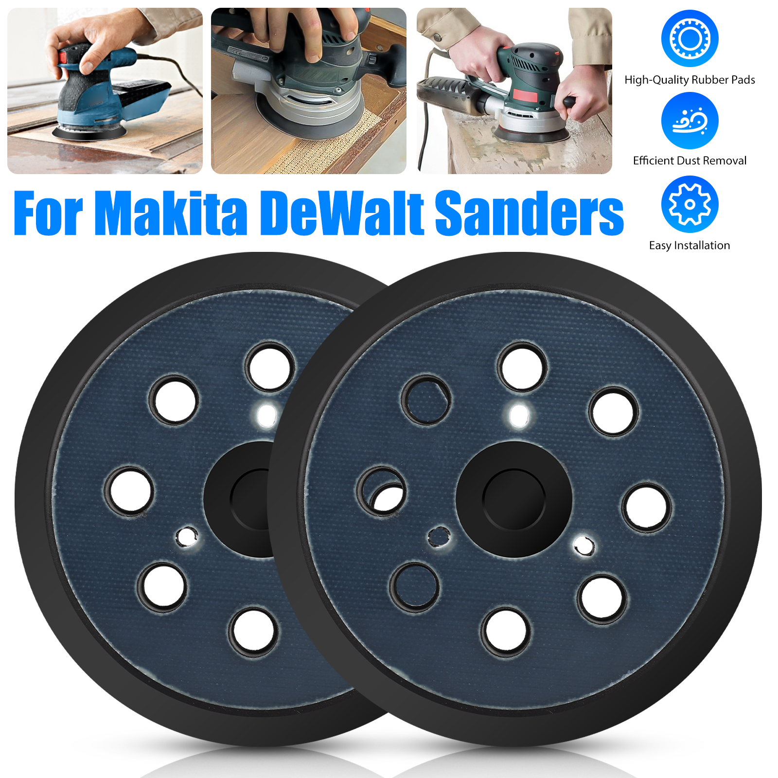 2PCS 5 Inch 8 Hole Hook and Loop Orbital Sander Replacement Pad for Makita Orbital Sander Replacement Pad Hook & loop design for quick and easy. Made of high quality, durable rubber for long life. To begin, you will need to first unplug the tool and remove the old pad from the sander. Eight holes for efficient for dust extraction. Makita sanding pad for sanding flat surfaces. 2 pcs replacement sander pad for dewalt/makita, 5 inch orbital sander. Makita Orbital Sander Replacement Pad.