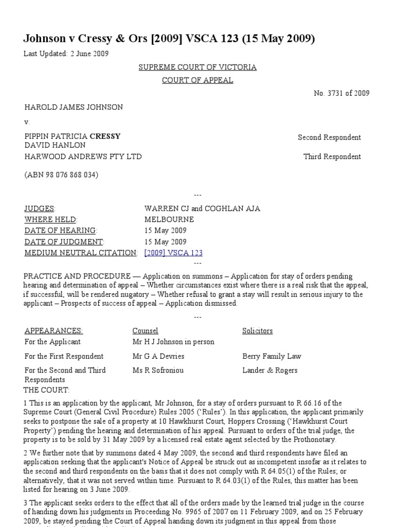 Johnson V Cressy & Ors (2009) VSCA 123 (15 May PDF Judgment (Law) Question Of Law