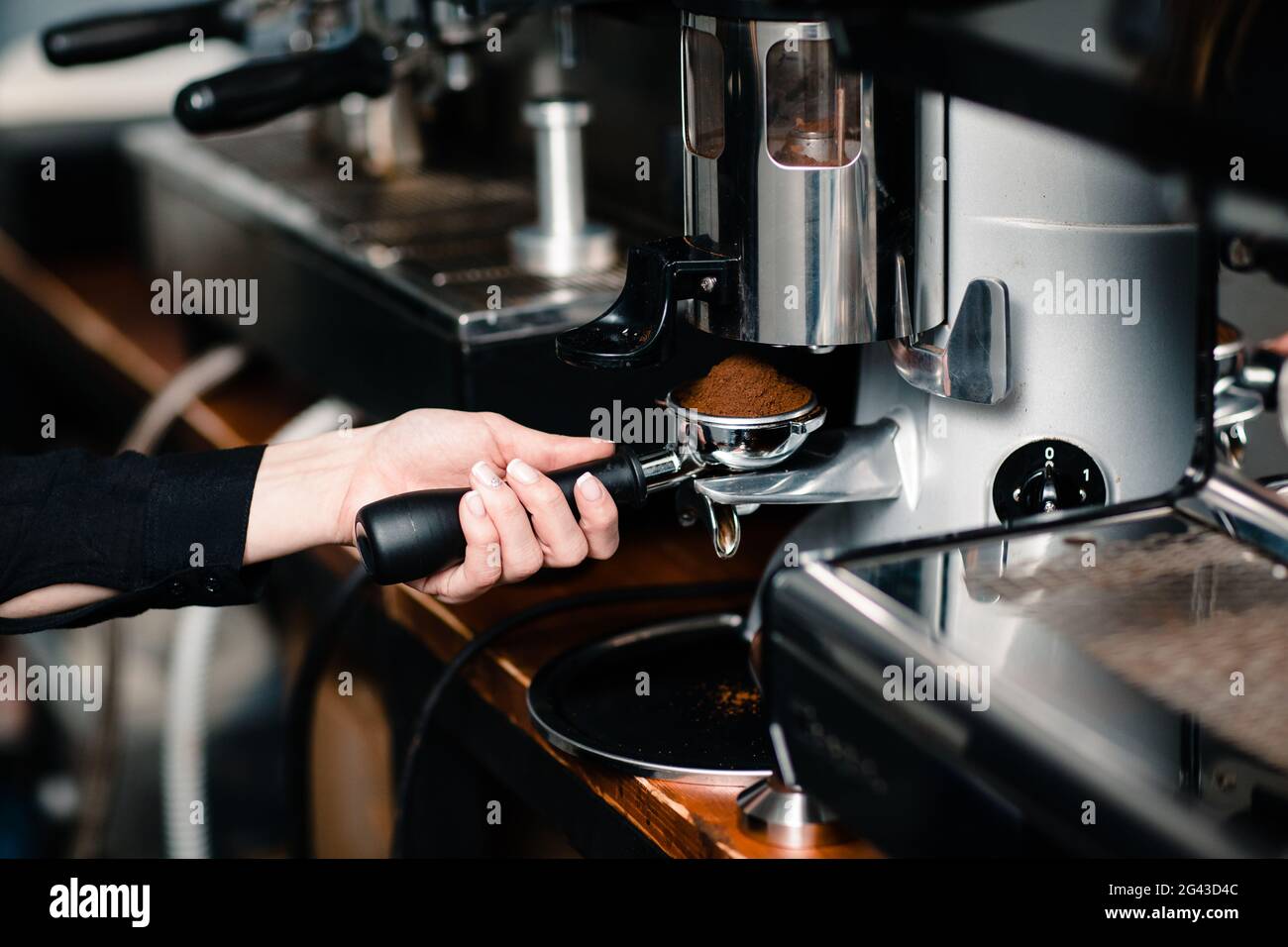 Coffee making, portafilter in grinder Stock Photo Alamy