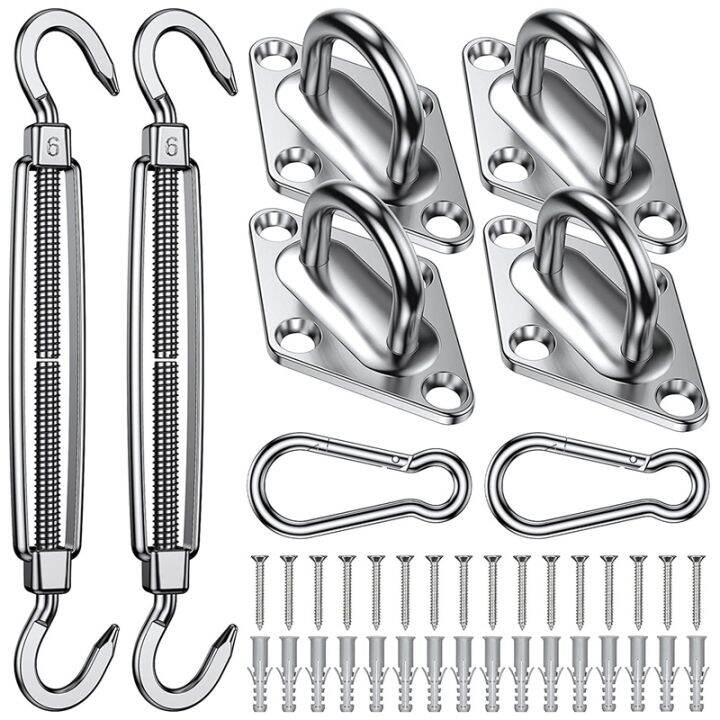 stainless steel, never rust. fzeneast shade sail hardware kit, 6 inch super heavy duty 304 marine grade stainless steel sun shade. 8 inches turnbuckle x 2pcs, diamond pad eye x 3pcs, carbineer/hook x 1pc. Our hardware kit is made of durable grade. this is a very heavy duty pole and anchor system that is made. colourtree triangle sun shade sail installation kits make installation of any shade sail a walk in the park.