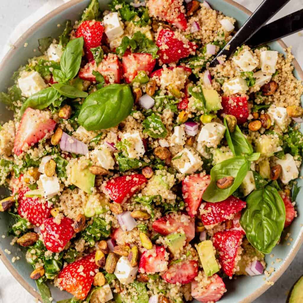 Quinoa Salad Dressing For best flavor, let the salad rest for 5 to 10 minutes before serving. In a large bowl, combine the quinoa, veggies, herbs, feta, olives, pine nuts, and half the dressing. Let the flavours mingle for 20 minutes at room temperate before serving. Once the quinoa is mostly cool, add it to the serving bowl, and drizzle the dressing on. Quinoa Salad Dressing.