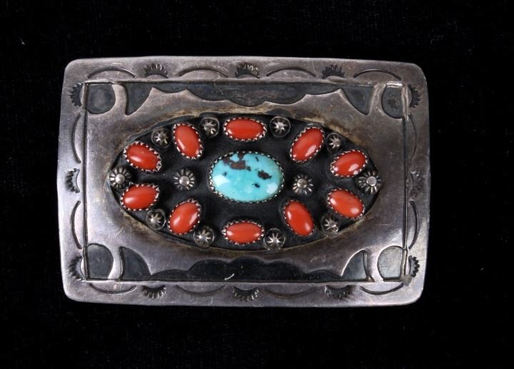 Navajo Old Pawn Turquoise & Red Coral Belt Buckle