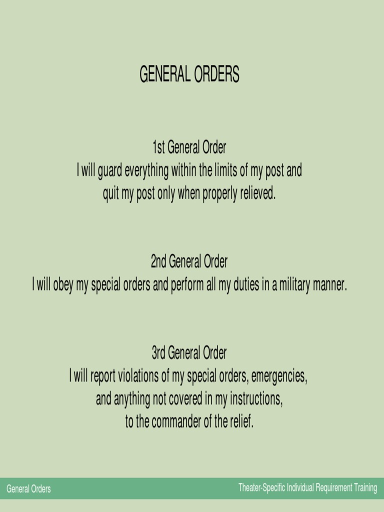 Army general orders powerpoint ukraineiron Army General Orders Here are the general orders for each branch of the military: A searchable spreadsheet of unit awards published in army general orders from 1947 to present. The 11 military general orders are the same for all branches of the u.s. It covers army ethics, values, history, organizations, training, pay, leave, and other topics. This document outlines the prohibited activities and. Army General Orders.
