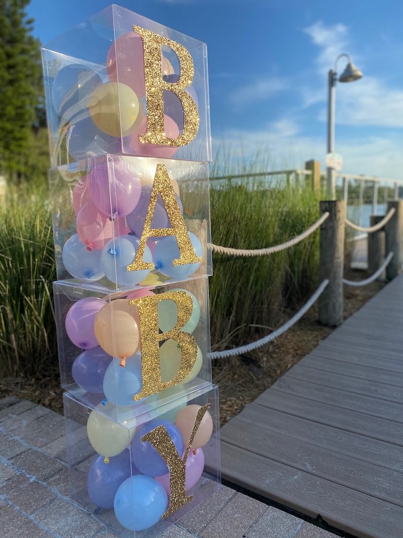 Gold transparent balloon boxes with 4 letters baby shower Etsy Baby Shower Decorations Balloon Box Stylish modern party supplies, personalised balloons, giant confetti balloons and party decorations for children parties, weddings, baby showers and special events. We make every baby shower and full month party all it can be, so take a look at our catalogue of decorations and discover the perfect thing for. Add a touch of magic to your celebration with our stunning. Baby Shower Decorations Balloon Box.
