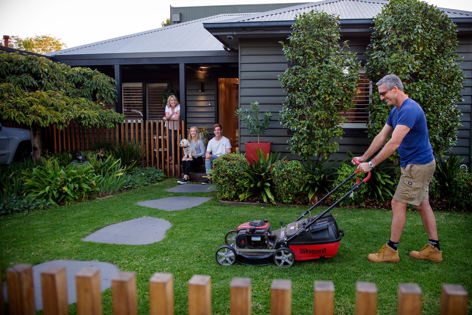 Digital Photograph Man Mowing Lawn at Home With Family During COVID19 Lockdowns, Northcote