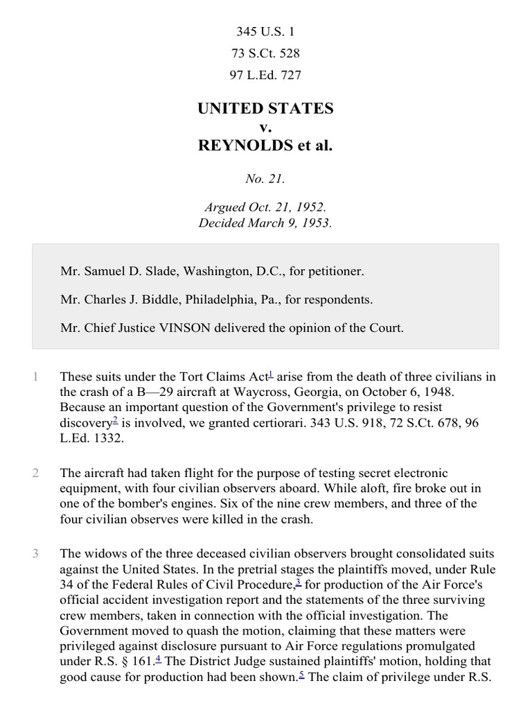 United States v. Reynolds, 345 U.S. 1 (1953) Supreme Court Of The