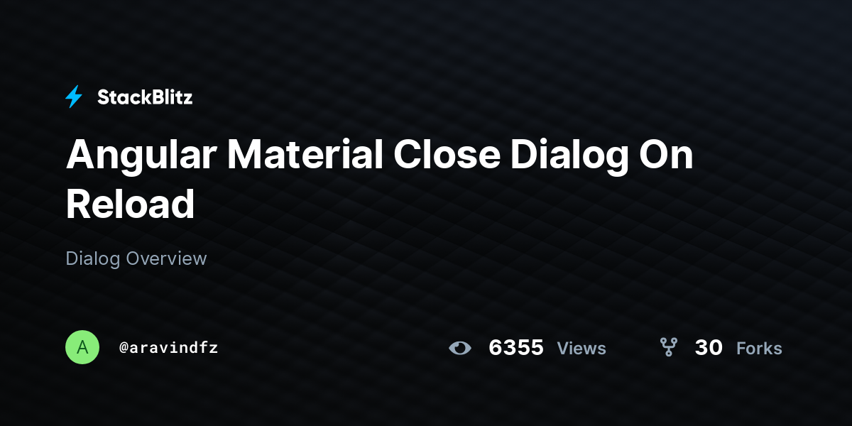 Angular Material Close Dialog On Reload StackBlitz Angular Material Dialog On Close learn how to use the matdialog service and its components to create modal dialogs in angular applications. learn how to use material dialog in angular material application with examples and code snippets. i am trying to get my material dialog to have an x button at the top right, but i am having problems with the positioning.. Angular Material Dialog On Close.