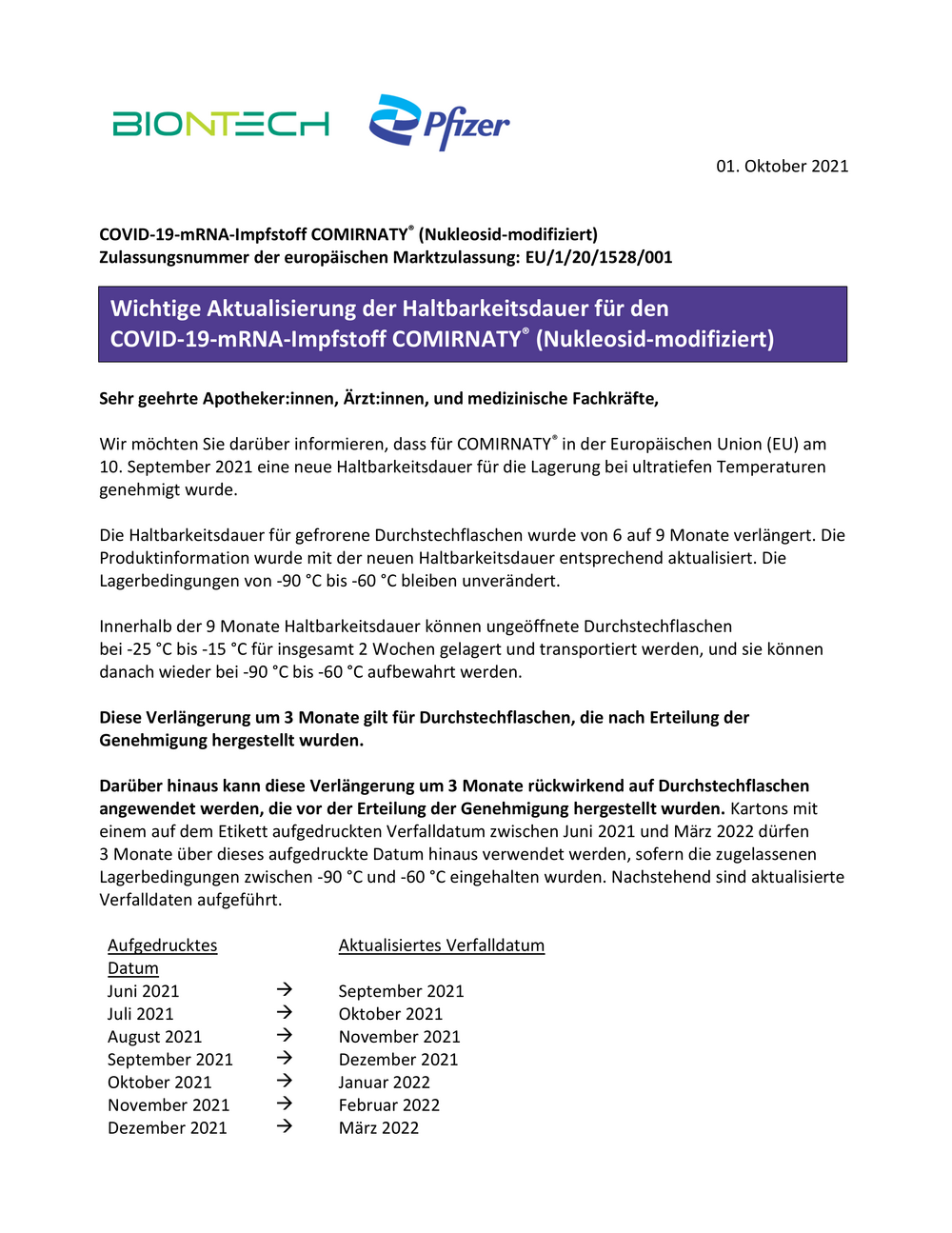 Comirnaty Shelf Life Extension Ema From a scientific point of view, ema concluded that the new 9 months shelf life could apply to already released batches of comirnaty,. “within the 1 month shelf life at 2 °c to 8 °c, up to 48 hours may be used for transportation.” ii/0135/g this was an application for a group of. On may 17, 2021, the european medicines agency (ema) has approved a change to the existing storage conditions. From a scientific point of view, ema concluded that the new 9 months shelf life could apply to already released batches of comirnaty,. Ema published updated product information for comirnaty following an increase in its approved shelf life: