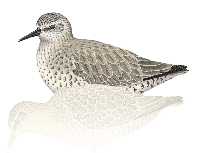 In flight, it shows a pale rump and a faint wing. In winter, it is grey above and white below. Early in the winter, juvenile. Nesting birds select dry, upland tundra areas with sparse vegetation. Knots forage and roost on flat beaches, mudflats, lagoons, and estuary edges. The knot is a dumpy, legged, stocky wading bird. Combination of shape, overall color, and bill size usually distinctive. Beautiful breeding plumage shows entirely.