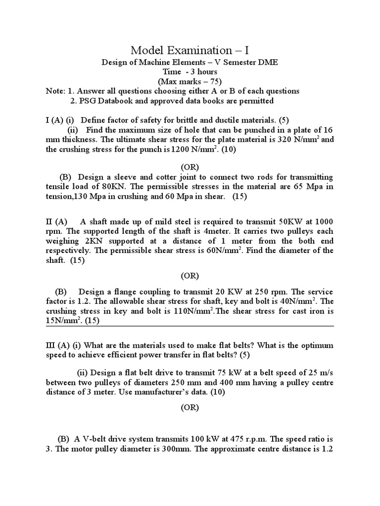 Design of Machine Elements Exam Questions Covering Factors of Safety