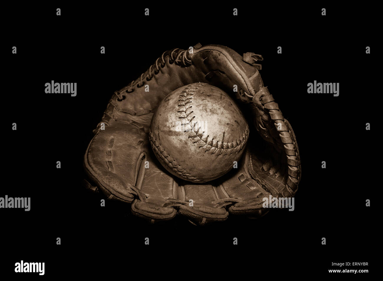 A worn softball sits inside an old baseball glove on a solid black