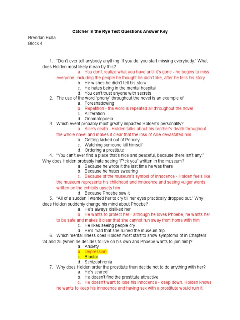 Catcher in The Rye Test Questions Answer Key PDF