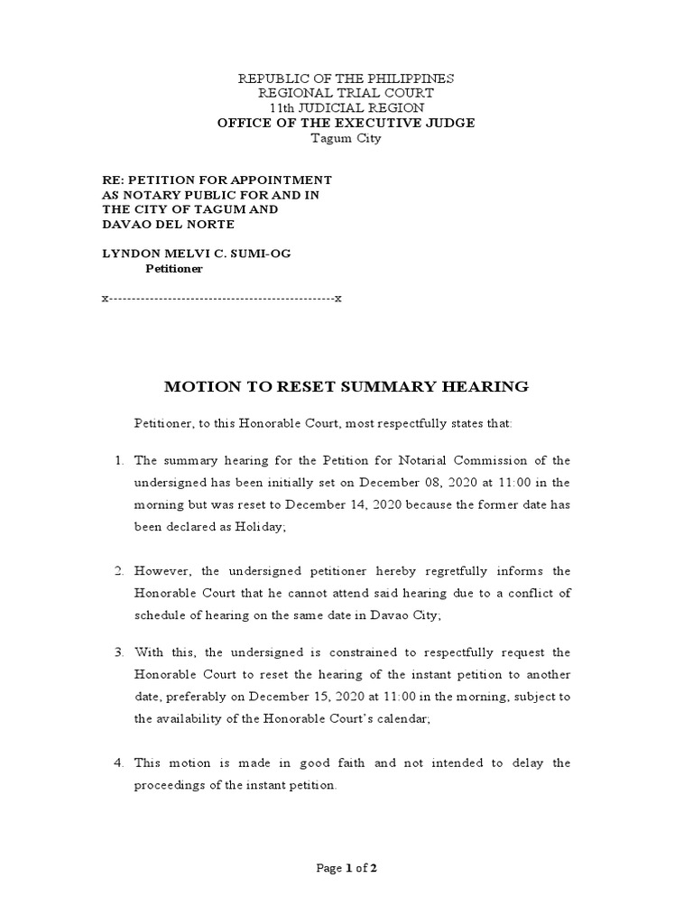 Motion To Reset Hearing Regional Trial Court Office of The Executive Motion To Reset Hearing Scribd motion to reset hearing the undersigned private prosecutor, under the direct control and supervision of the public prosecutor, unto this. honorable court to reset the hearing of the instant case to another date, subject to the availability of the honorable court’s calendar. This motion is made in. For many civil cases, a request for a continuance is made. Motion To Reset Hearing Scribd.