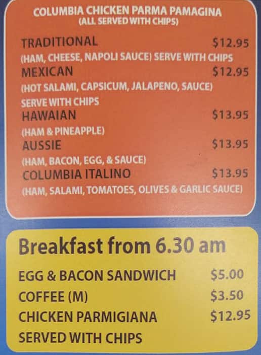 Carta del café Columbia Road Fish & Chips, Narre Warren