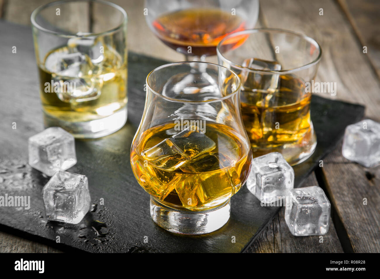 Different types of strong alcohol bourbon, whiskey, scotch and cognac