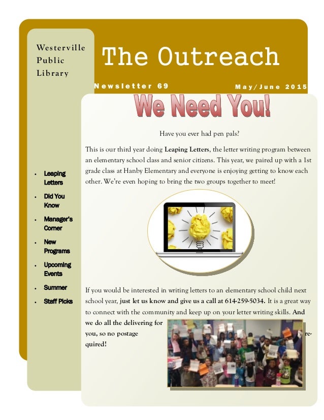 Youth Outreach Newsletter January 2018 DPD Beat Outreach Newsletter Sharing stories of outreach, helping christian leadership discover the ideas, innovations and resources that will equip them. Let’s dive into our top ten nonprofit newsletter ideas, which you can turn to again and again. Get the latest updates, outreach ideas, new product announcements and sale information when you subscribe to our email newsletters. Outreach emails that contain links to social. Outreach Newsletter.