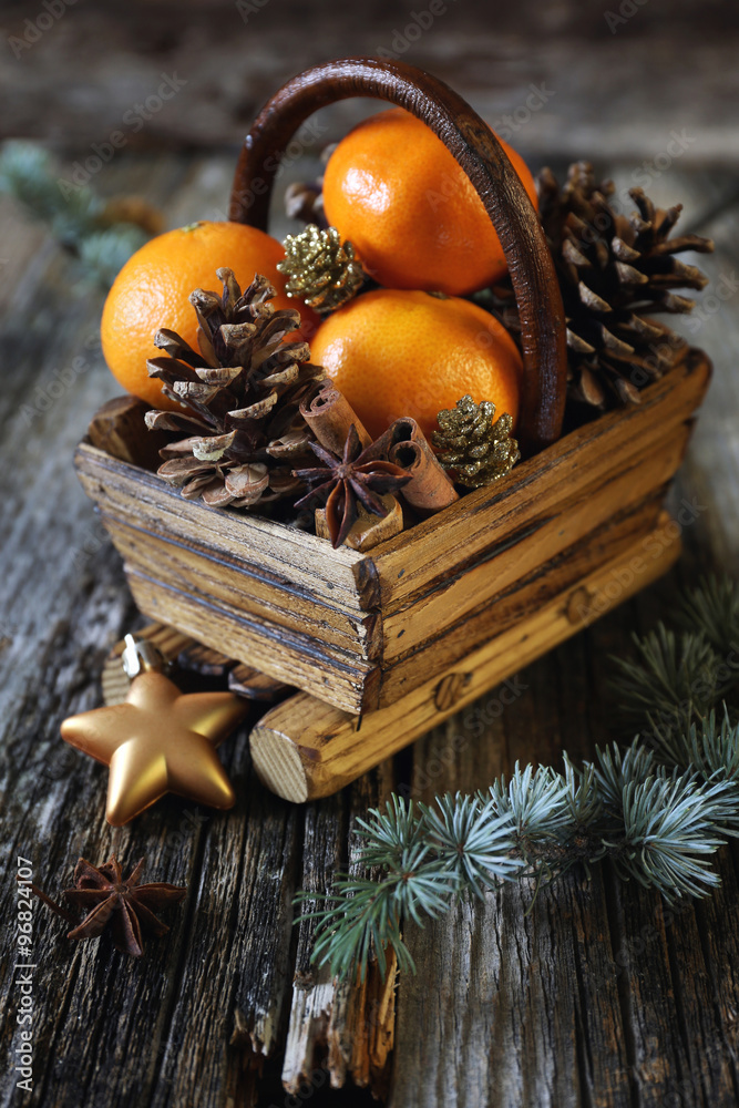 Foto de New Year's basket with tangeriness and pine cones do Stock
