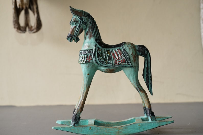 Wooden Rocking Horse Statue Wash Green Color Horse Gifts Art Etsy