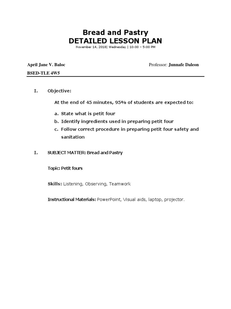 Lesson Plan in Bread and Pastry Producti PDF Bread And Pastry Lesson Plan The lesson focuses on identifying and classifying. [1] the objectives are for students to demonstrate. As shown below, each lesson is directed to the attainment of one, two, three or four learning outcomes: The lesson focuses on different mixing. At the end of the lesson the learner’s will be able to: Differentiate the tools and equipment in. This detailed lesson. Bread And Pastry Lesson Plan.
