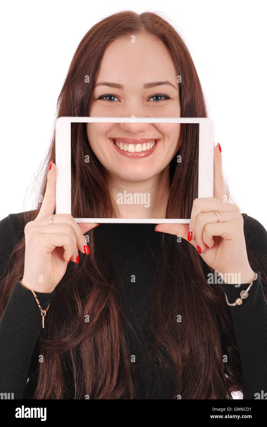 Girl with digital tablet making funny selfie isolated on white Stock