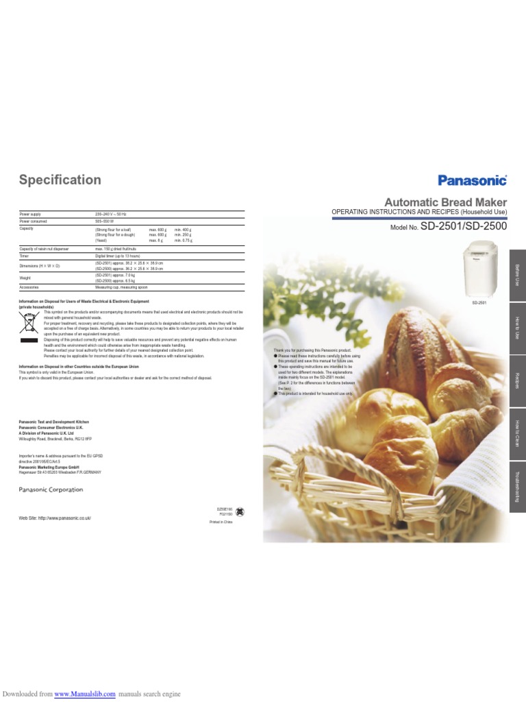 PANASONIC SD2511WTS AUTOMATIC BREAD MAKER Service Manual download Panasonic Bread Machine Manual Automatic bread maker (household use). Please read these instructions carefully before using this product and save this manual for future use. This product is intended for household use. Automatic bread maker operating instructions and recipes (household use) model no. Remove the kneading blade and line the greaseproof paper around the bread pan, then pour in the mixed ingredients. With a. Panasonic Bread Machine Manual.