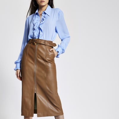 Brown faux leather zip front midi skirt River Island