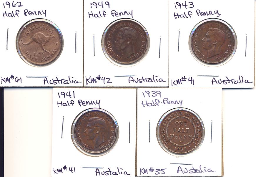 (5) AUSTRALIAN 1/2 PENNIESAU TO UNC INCLUDES KEY DATE