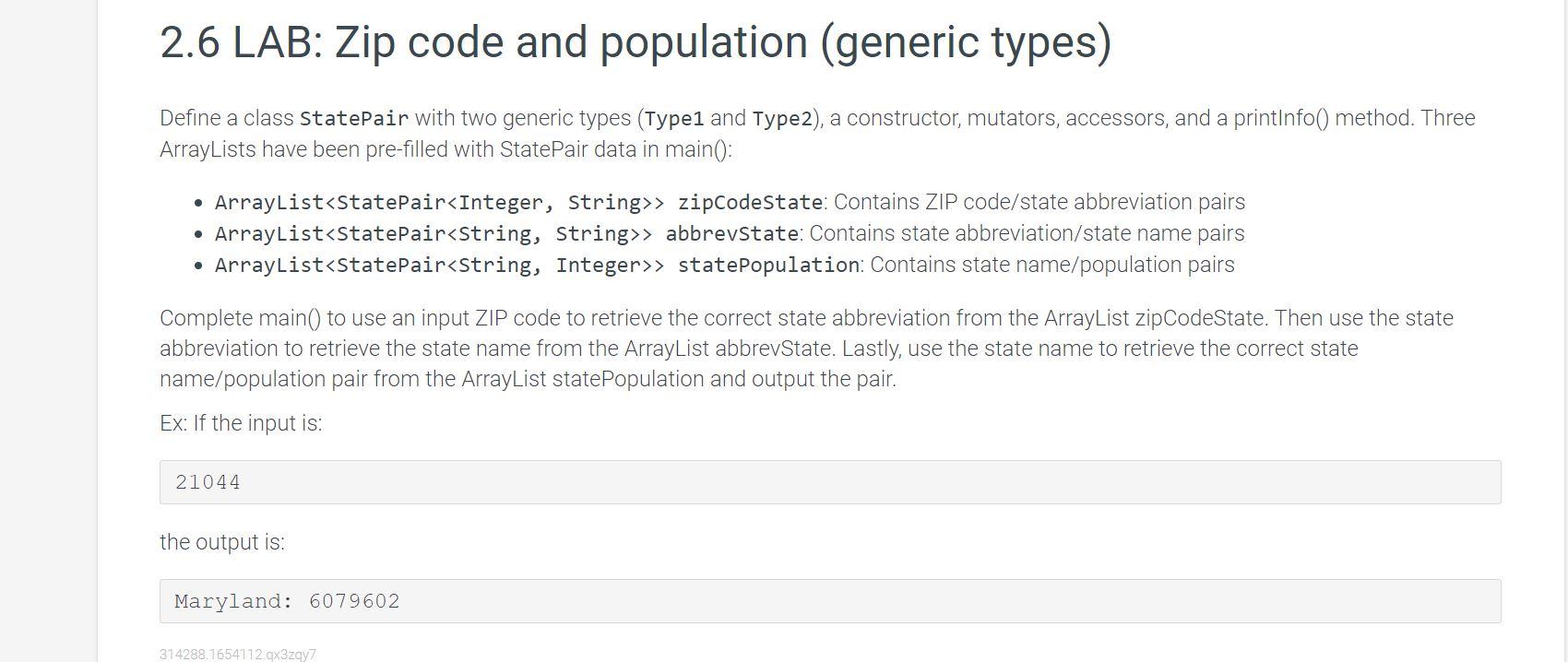Solved 3.2 LAB Zip code and population (generic types) Lab Zip Code And Population (Generic Types) Zip code and population (generic types) define a class statepair with two generic types (type1 and type2), a. anyone done 13.6 lab: Zip code and population (generic types) define a class statepair with two generic types (type1 and type2), a constructor, mutators,. Zip code and population (generic types) in zybooks. about press copyright contact us creators advertise developers. Lab Zip Code And Population (Generic Types).