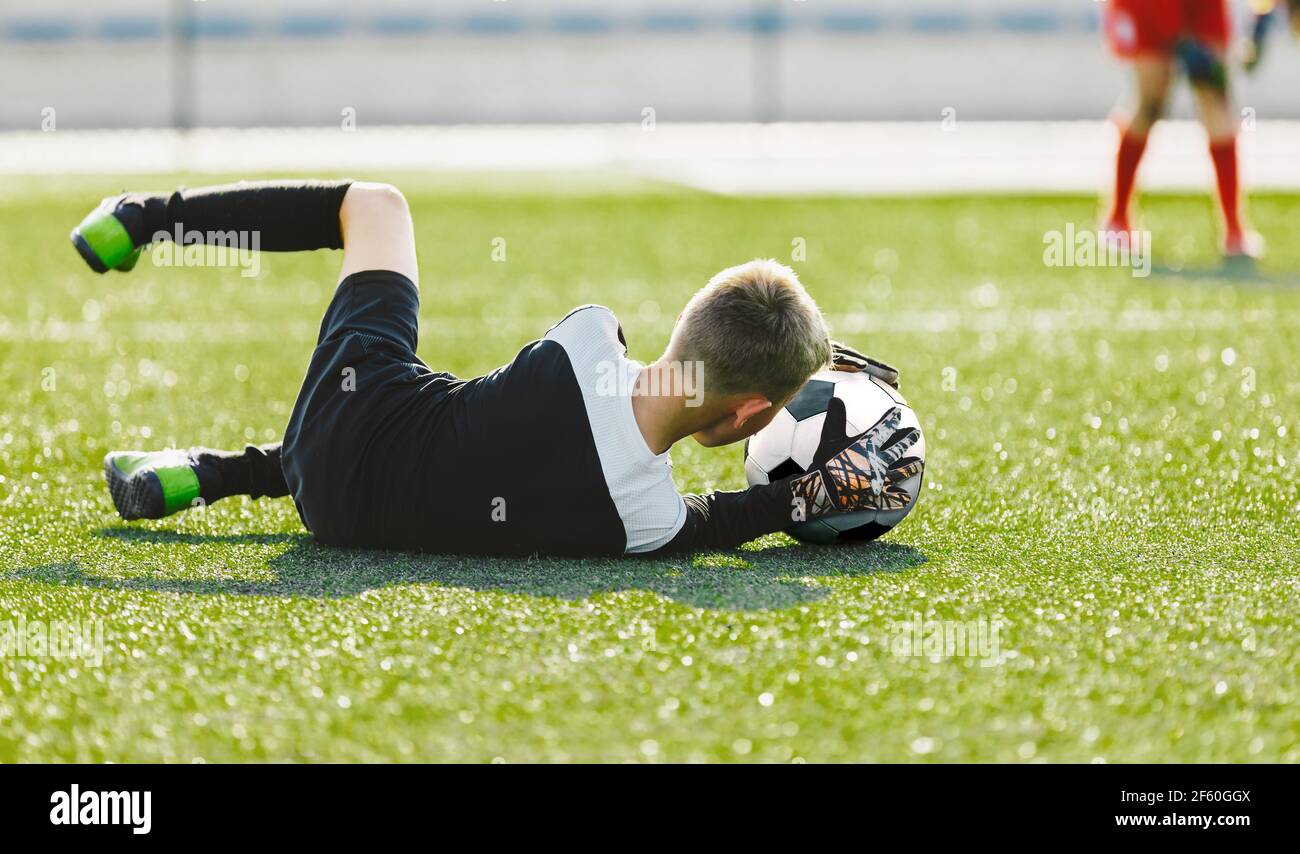 Soccer Goalie Drills. Young Boy as a Soccer Goalkeeper in Action Catching Ball. Football Kid