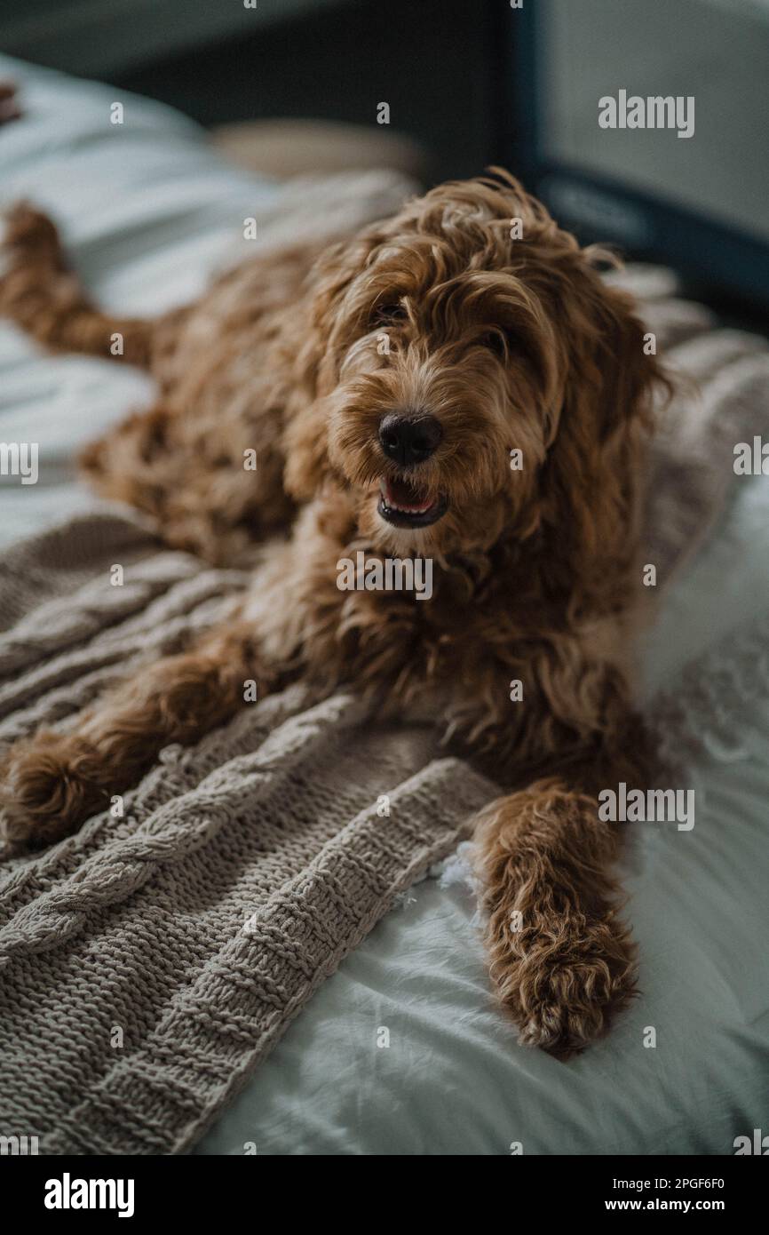 Furry goldendoodle dog sitting on a bed Stock Photo Alamy