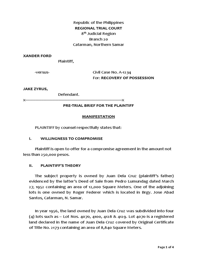 PreTrial Brief for Plaintiff Sample Lawsuit Politics